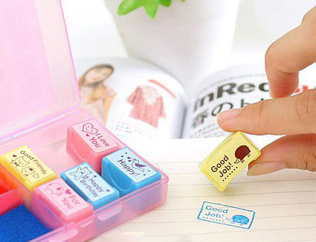 This is a cute mini stamps with 6 different pieces. There are 2 ink pads inside in this set, red and blue. You can stamp them on your book, notebook, whatever crafts that requires stamping.
